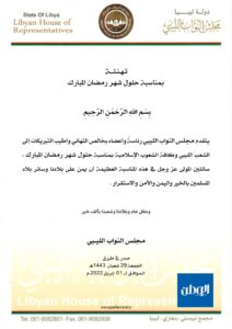 هنأ مجلس النواب الليبي في بيان له، جميع الليبيين والأمة الإسلامية، بمناسبة حلول شهر رمضان المبارك، الذي يبدأ أول أيامه، غداً السبت.