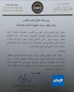 وقالت اللجنة في بيان صادر عنها اليوم إنّ هذا القرار جاءَ مدفوعًا بضغط الميليشيات المسيطرة على حكومة الدبيبة، مؤكّدة أن القوات المسلحة وجهاز الأمن الداخلي لا يخضعون لأي مساومات أو ضغوطات ويقومون بواجبهم في جميع أنحاء ليبيا على حد تعبير البيان