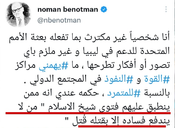 وكتب بن عثمان عبر حسابه في تويتر: “‏أنا شخصياً غير مكترث بما تفعله بعثة الأمم المتحدة للدعم في ليبيا و غير ملزم باي تصور أو أفكار تطرحها ، ما ‎يهمني مراكز ‎القوة و ‎النفوذ في المجتمع الدولي .