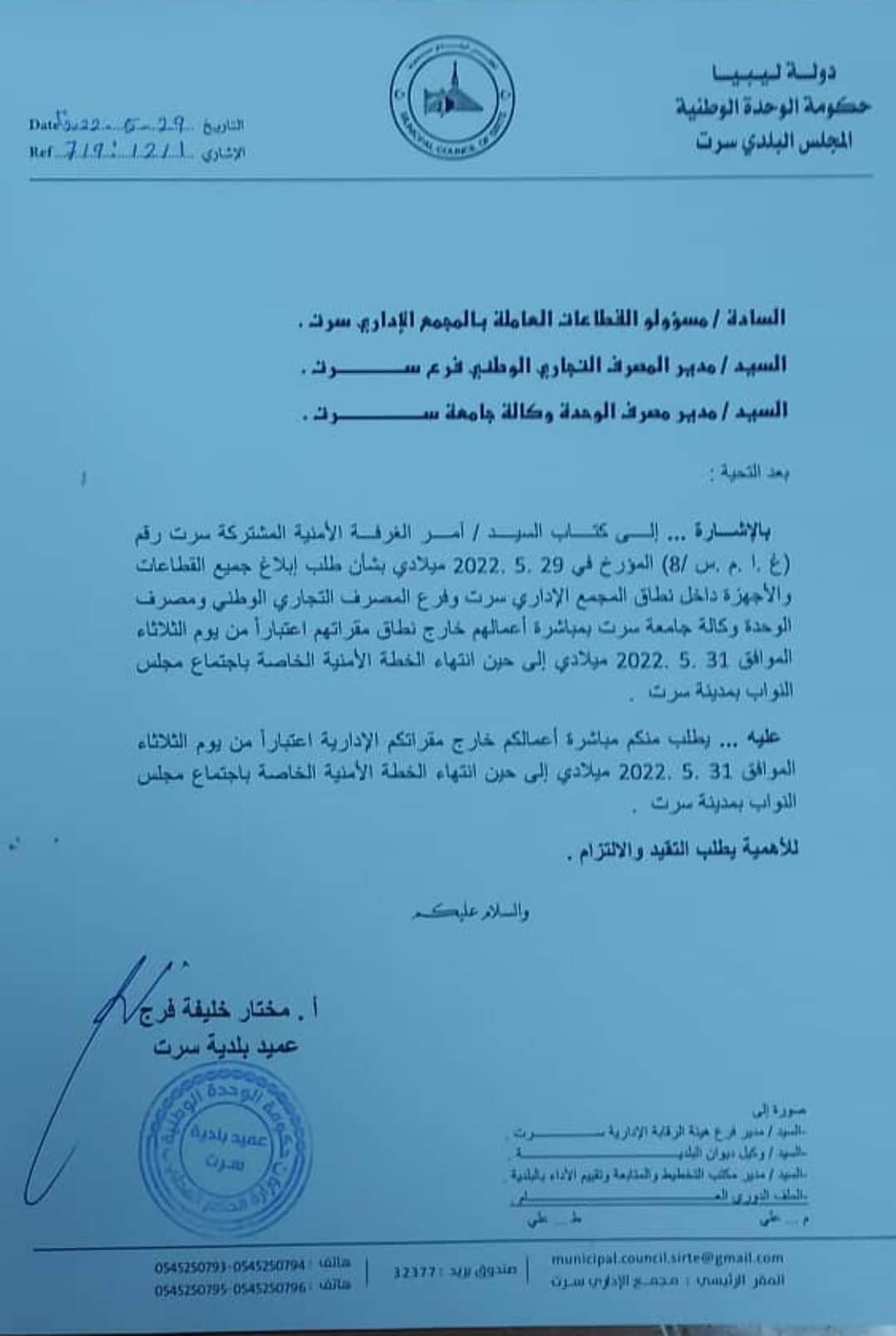 وقال فرج، في كتاب موجه إلى مسؤولي القطاعات العاملة بالمجمع الإداري سرت، ومدير المسرف التجاري الوطني، فرع سرت، ومدير مصرف الوحدة وكالة جامعة سرت، إن هذا القرار يأتي بناء على طلب آمـر الغرفة الأمنية المشتركة سرت بإبلاغ الجهات المذكورة بمباشرة أعمالهم خارج نطاق مقراتهم اعتبارا من الثلاثاء إلى حين انتهاء الخطة الأمنية الخاصة باجتماع مجلس النواب بمدينة سرت.