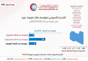 أعلن المركز الوطني لمكافحة الأمراض في التحديث الأسبوعي للوضع الوبائي المحلي لفيروس كورونا أن متوسط عدد الوفيات بكورونا في ليبيا بلغ صفرا.
