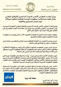 ودعا الأعضاء وفقاً لبيان رصدته وتابعته الوطن، الحكومة منتهية الولاية إلى تحمل مسؤوليتها الأخلاقية والقانونية في هذا الصدد، بالتزامن مع انتهاء المدة الزمنية لخارطة الطريق وانتهاء ولاية حكومة الدبيبة.