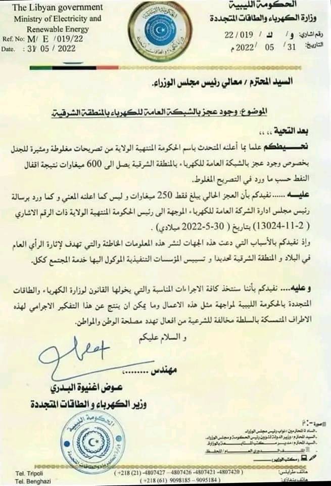 فندّ وزير الكهرباء والطاقات المتجددة بالحكومة الليبية، عوض البدري، إدعاءات المتحدث باسم حكومة الدبيبة حول وجود عجز بالمنطقة الشرقية يصل إلى “600 ميجاوات” نتيجة إقفال النفط.