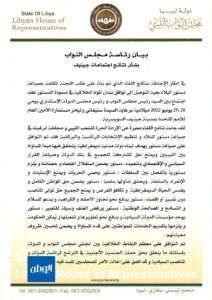 أصدرت رئاسة مجلس النواب بياناً، حول نتائج لقاء رئيس مجلس النواب المستشار عقيلة صالح، ورئيس مجلس الدولة خالد المشري، المنعقد في مدينة جينف.