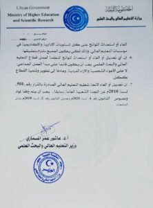 استنكرت وزارة التعليم العالي بالحكومة الليبية تعديلات وزارة التعليم العالي بالحكومة منتهية الولاية على لائحة تنظيم التعليم العالي الصادرة بالقرار رقم (501) عام 2010، واصفةً وزير التعليم العالي بحكومة الدبيبة بـ”منتحل صفة الوزير”.