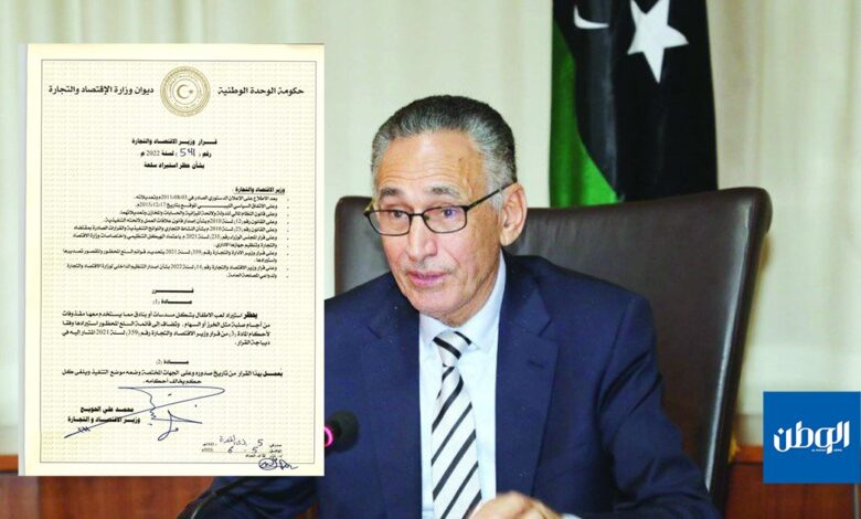قرر وزير التجارة والاقتصاد في الحكومة منتهية الولاية محمد حويج، حظر استيراد ألعاب الأطفال التي تكون على شكل مسدسات أو بنادق.