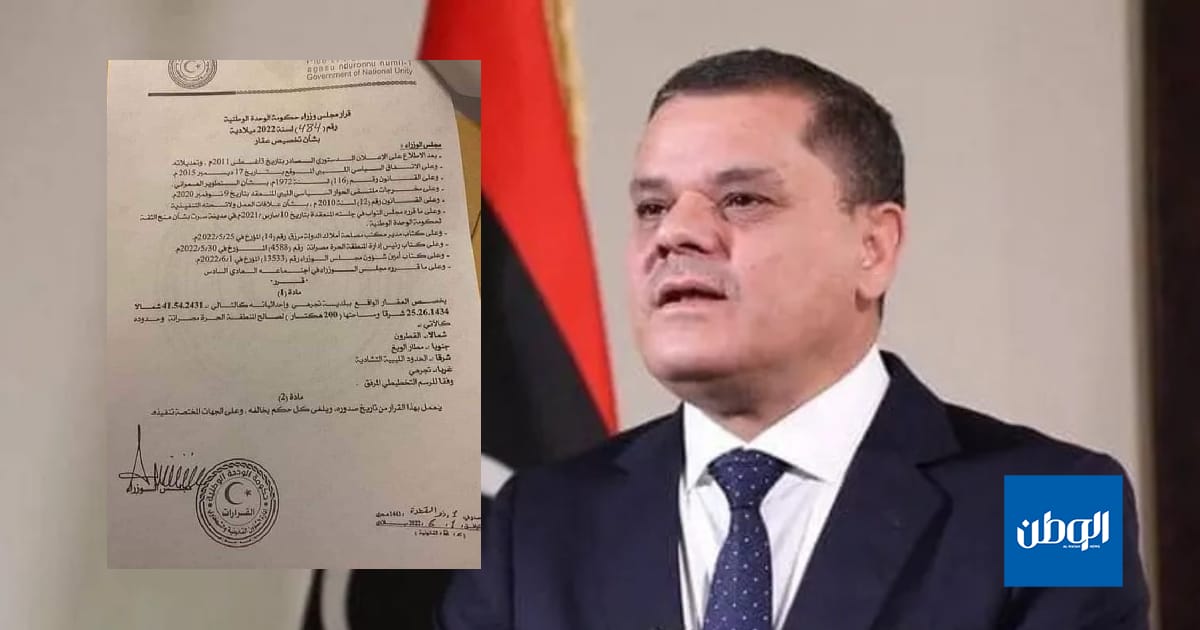 قرر مجلس وزراء الحكومة منتهية الولاية برئاسة عبدالحميد الدبيبة تخصيص عقار مساحته 200 هكتار لصالح المنطقة الحرة مصراته.
