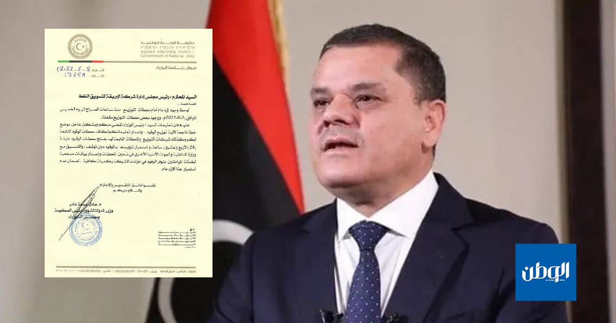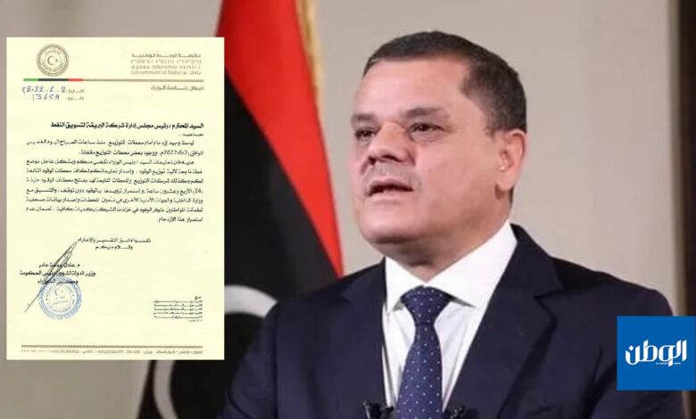 طلب رئيس حكومة منتهية الولاية عبد الحميد الدبيبة، في كتاب موجه لرئيس مجلس إدارة شركة البريقة لتسويق النفط؛ بوضع خطة ناجعة لآلية توزيع الوقود، وفتح محطات التوزيع طيلة الأربع وعشرين ساعة واستمرار تزويدها بالوقود دون توقف.
