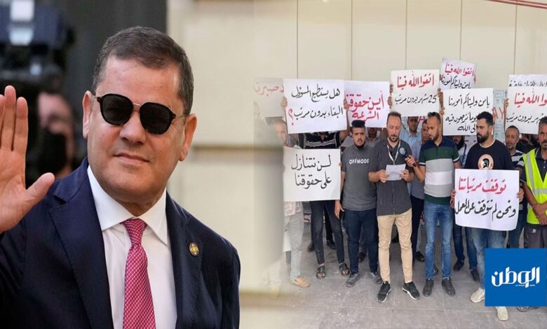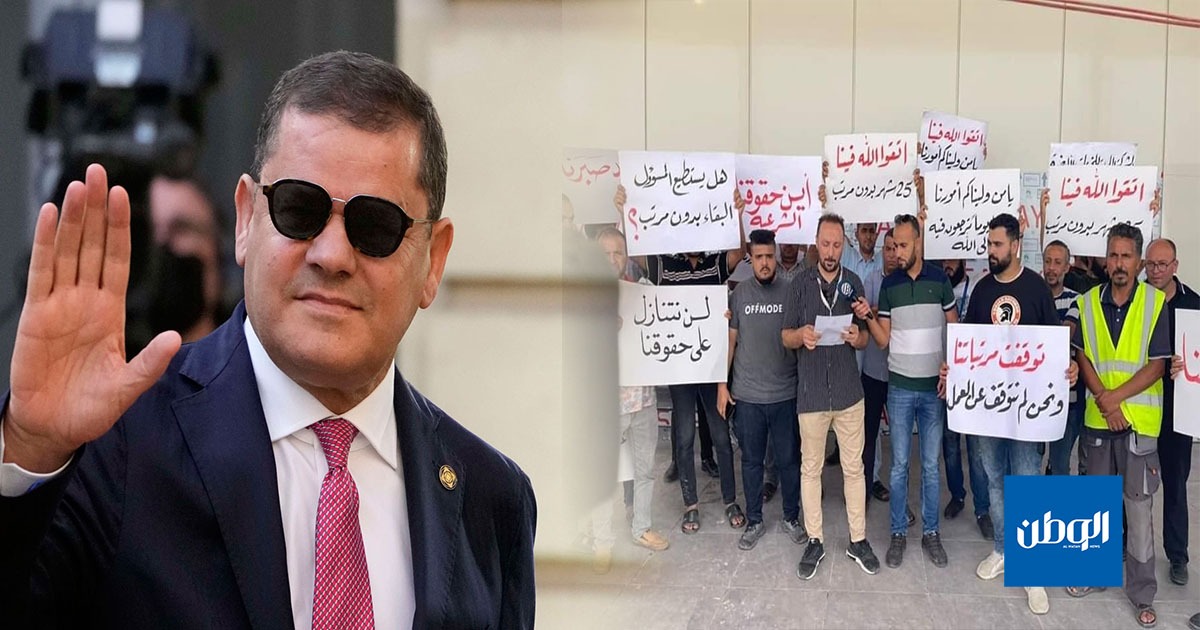 جاء ذلك، ضمن مهاتفات ورفع اعلام تهاجم رئيس الحكومة المنتهية الولاية، عبدالحميد الدبيبة، بسبب كثرة الوعود التي ابرمها بشان دفع مستحقاتهم لكنه اخلف بوعده .