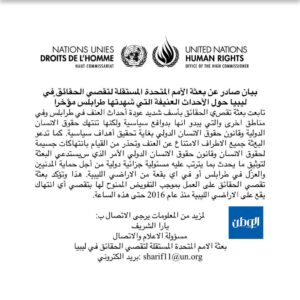 دعت بعثة الأمم المتحدة لتقصي الحقائق في ليبيا، جميع الأطراف الليبية إلى الامتناع عن العنف، محذرة القيام بانتهاكات جسيمة لحقوق الإنسان وقانون حقوق الإنسان الدولي.