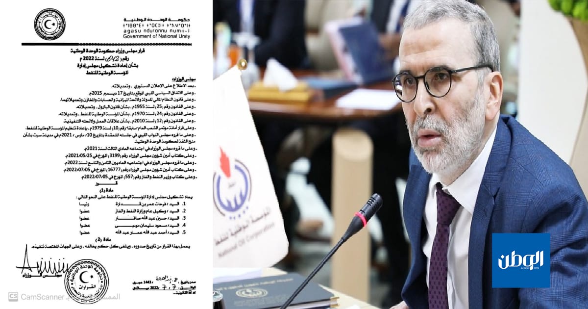 وكان رئيس الحكومة المنتهية عبدالحميد الدبيبة قد أصدر قرارا يقيل بموجبه مصطفى صنع الله ويكلف مجلس ادارة جديد برئاسة فرحات بن قدارة وعضوية كل من وكيل عام وزارة النفط والغاز، وحسين عبدالله، ومسعود سليمان، وأحمد عبدالله عمار.