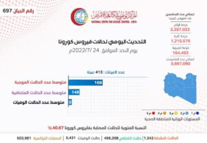 وحسب التحديث اليومي الصادر عن المركز، فقد بلغت نسبة الحالات الموجبة 40.67% من عدد العينات البالغ 413 عينة، من بينها 245 عينة سالبة. واستحوذت العاصمة طرابلس على أكبر عدد من الإصابات بواقع 132 حالة.