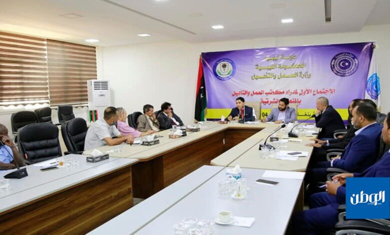 وبحسب المكتب الإعلامي للحكومة، جاء ذلك خلال لقاء عقد الإثنين، بديوان مجلس الوزراء بنغازي، استعرض خلاله الوزير الحلول المناسبة لأبرز الصعوبات من أجل إعادة تفعيل دور المكاتب، إضافةً إلى مناقشة عدة ملفات من بينها ، التشغيل والتدريب والتأهيل والتفتيش العمالي، وضرورة مكافحة الفساد، ودعم المشاريع المتوسطة والصغرى وملف الأستخدام.