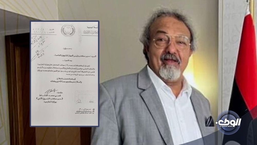وأحال جهاز المخابرات الليبية بيانًا سريًا لمدير مكتب رئيس الجهاز للشؤون الخاصة يحتوي على كشف بعدد 15 موظف للعاملين خارج وزارة الخارجية والتعاون الدولي، موفدين للعمل بالخارج، كان من ضمنهم أبن رئيس جهاز المخابرات.