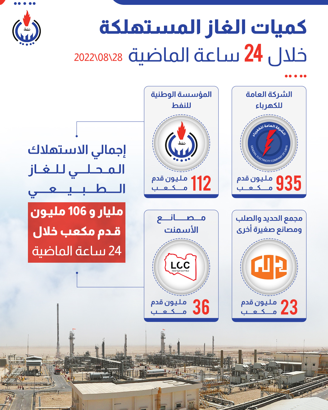 وبلغ إجمالي الاستهلاك المحلي للغاز الطبيعي مليارا و 106 مليون قدم مكعب خلال الـ24 ساعة الماضية، وفق مؤسسة النفط.