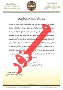 نفى المتحدث الرسمي باسم مجلس النواب الليبي، عبدالله بليحق، صحّة البيان المنسوب إلى رئيس المجلس المستشار عقيلة صالح، والذي ورد فيه استنكار “صالح” لتصريحات السفير الأمريكي لدى ليبيا ريتشارد نورلاند.