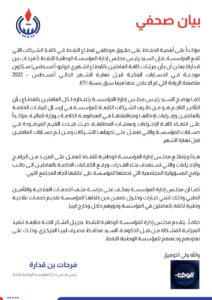 وقدم بن قدارة في بيان له اعتذاره لجميع العاملين بسبب التأخير في صرف الزيادة عازياً ذلك إلى تأخر الشركات التابعة للمؤسسة في إرسال البيانات الخاصة بالعاملين من أجل مطابقتها مع منظومة وزارة المالية.