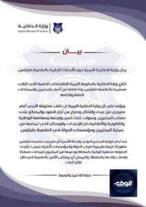 أصدرت وزراة الداخلية في الحكومة الليبية اليوم السبت، بيانًا حول الاشتباكات المسلحة في العاصمة طرابلس.