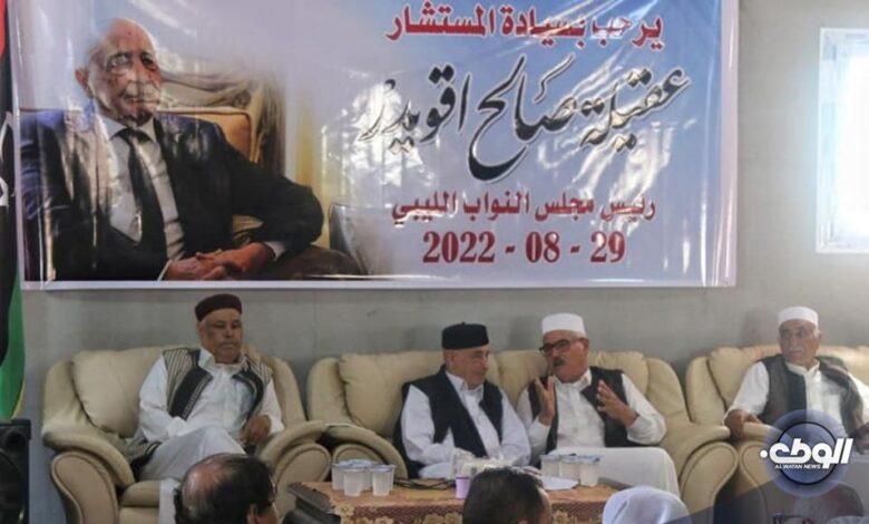 وبحسب المكتب الإعلامي للناطق باسم مجلس النواب، عبد الله بليحق، أكد عمداء وأعيان وشباب قبيلة ” شاهين ” عبيدات خلال لقائهم بالمستشار ” عقيلة صالح ” دعمهم لمجلس النواب الجسم الشرعي المُنتخب من الشعب، مشددين على ضرورة إجراء الإنتخابات الرئاسية والبرلمانية في أقرب الآجال.