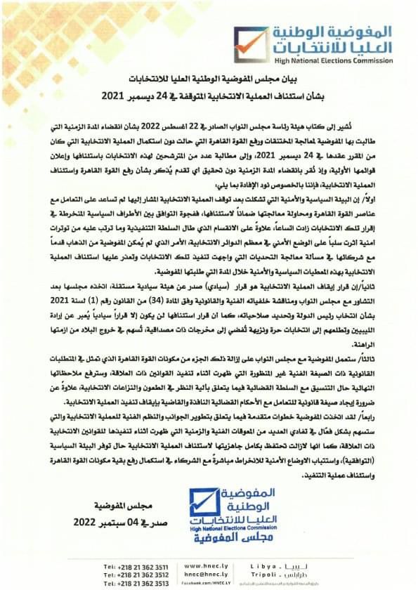 وأشارت المفوضية إلى أن قرار إيقاف العملية الانتخابية هو قرار (سيادي) صدر عن هيئة سيادية مستقلة، اتخذه مجلسها بعد التشاور مع مجلس النواب ومناقشة خلفياته الفنية والقانونية وفق المادة (34) من القانون رقم (1) لسنة 2021 بشأن انتخاب رئيس الدولة وتحديد صلاحياته، كما أن قرار استئنافها لن يكون إلا قراراً سيادياً يعبر عن إرادة الليبيين وتطلعهم إلى انتخابات حرة ونزيهة تفضي إلى مخرجات ذات مصداقية، تسهم في خروج البلاد من ازمتها الراهنة.