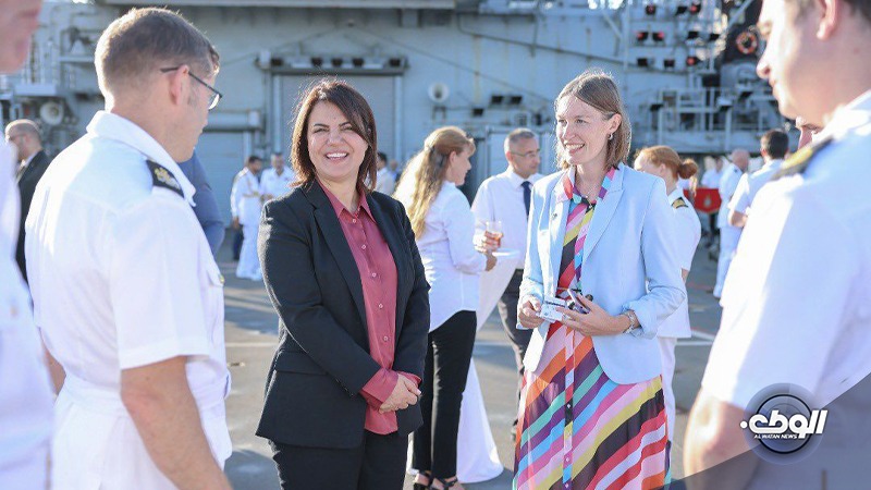 رحبت وزيرة الخارجية بحكومة الدبيبة نجلاء المنقوش برسو سفينة إنزال بريطانية في طرابلس.