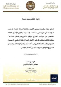 دعا مجلس النواب إلى عقد جلسة رسمية يوم الإثنين المقبل، الموافق الخامس من سبتمبر في مدينة بنغازي .