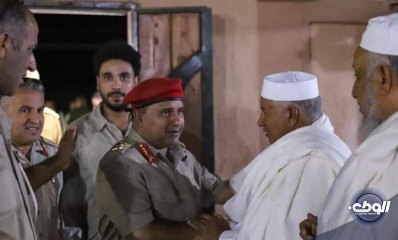 قدّم مدير مكتب القائد العام للقوات المسلحة، الفريق خيري التميمي، التعازي لأسرة الفقيد علي حمودة، المنسق الاجتماعي بالقيادة العامة لمنطقة وادي الشاطي خلال زيارته للنصب التذكاري لمعركة المحروقة.