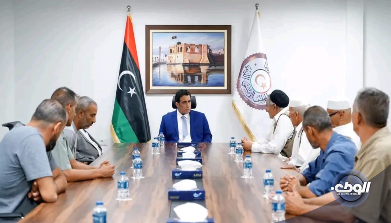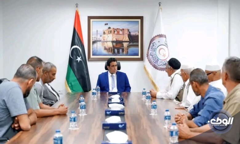 التقى رئيس المجلس الرئاسي محمد المنفي اليوم الأحد بممثلين عن المجلس البلدي والأعيان والحكماء وإدارة نادي الجبل الأصابعة.