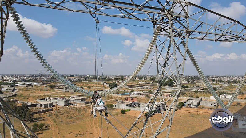 تواصل الشركة العامة للكهرباء استكمال نقل الطاقة الكهربائية لخط التبة بئر الاسطى ميلاد جهد 400 ك.ف الرابط بين محطتي التبة بئر الاسطى ميلاد الذي وصل إلى نسب إنجاز متقدمة.