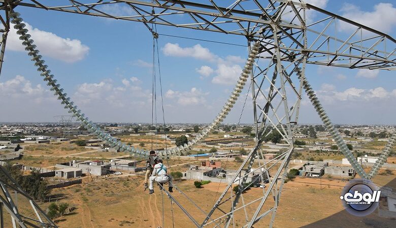 تواصل الشركة العامة للكهرباء استكمال نقل الطاقة الكهربائية لخط التبة بئر الاسطى ميلاد جهد 400 ك.ف الرابط بين محطتي التبة بئر الاسطى ميلاد الذي وصل إلى نسب إنجاز متقدمة.