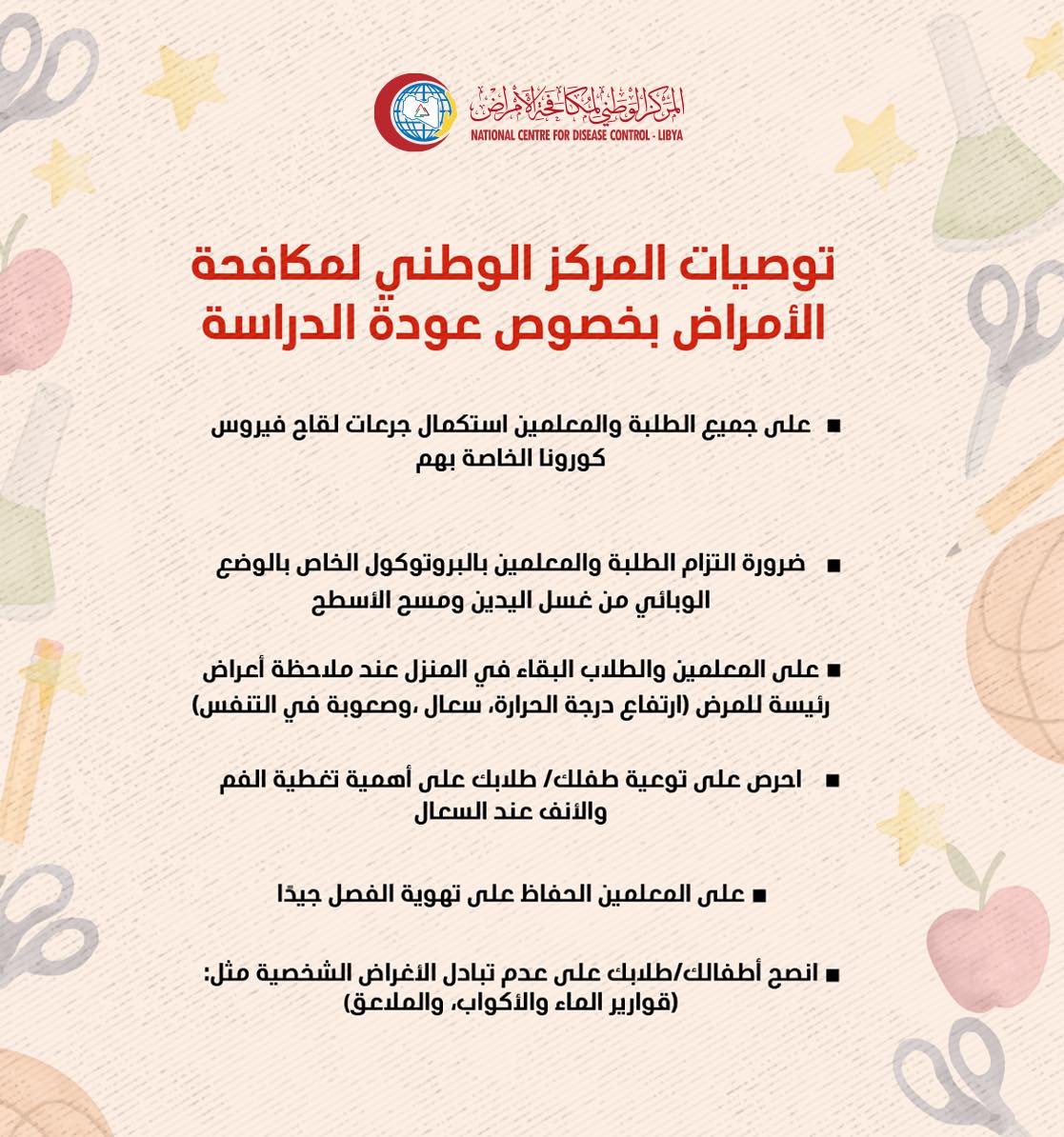 نشر المركز الوطني لمكافحة الأمراض، اليوم الثلاثاء، توصيات بخصوص انطلاق العام الدراسي الجديد 2022 – 2023.