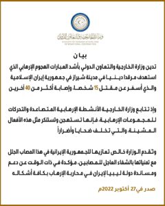 وتقدّم البيان بخالص التعازي للجمهورية الإيرانية، مؤكدا دعم ليبيا ومساندتها لإيران في محاربة الإرهاب بكافة أشكاله.