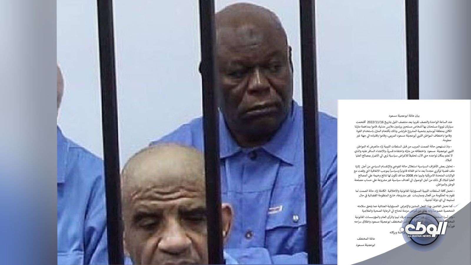 وقالت العائلة في بيان إن أبو عجيلة مسعود جرى اختطافه من المنزل واقتياده إلى جهة غير معلومة في الواحدة والنصف بعد منتصف الليل الموافق لـ 2022/11/16، بعد أن اقتحمت المنزل مجموعة من المسلحين الذين كانوا يستقلون سيارتين تويوتا مسلحتين، ويرتدون ملابس مدنية.