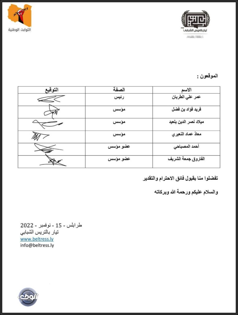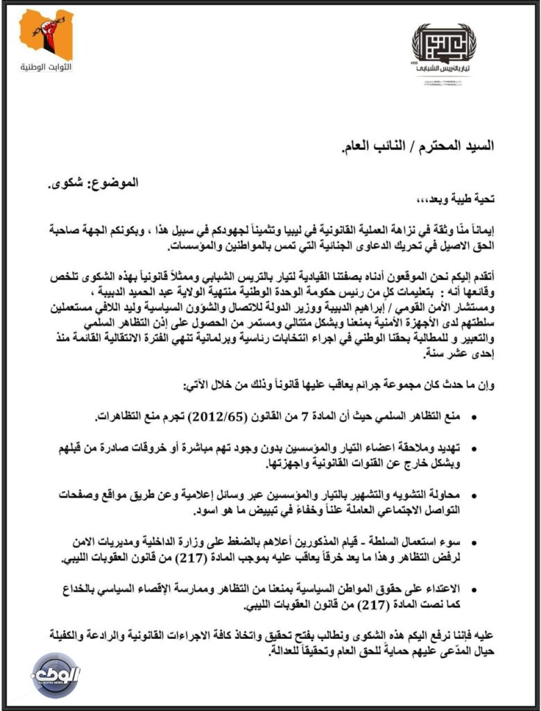 ووفقاً لفحوى أن منتهي الولاية عبد الحميد الدبيبة وإبراهيم الدبيبة ووليد اللافي، استخدموا سلطتهم لمنع التيار من الحصول على إذن التظاهر السلمي، للمطالبة بحقنا في إجراء انتخابات رئاسية وبرلمانية تُنهي الفترة الانتقالية القائمة منذ 11 سنة.
