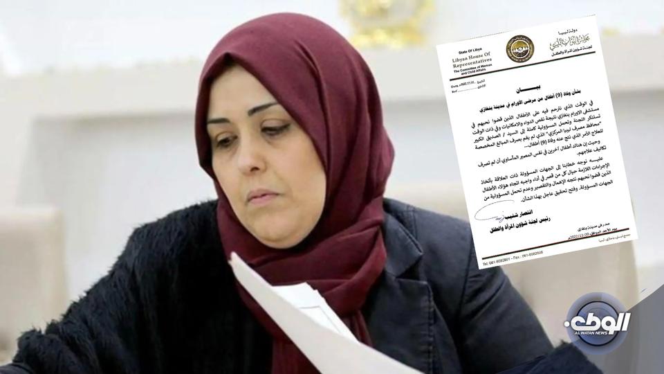 أصدرت رئيسة لجنة شؤون المرأة والطفل بيانًا بشأن وفاة 9 أطفال من مرضى الأورام في مدينة بنغازي، نتيجة لنقص الدواء والإمكانات العلاجية.