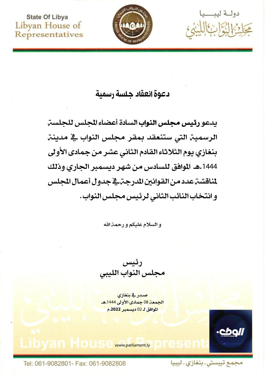 دعا رئيس مجلس النواب المستشار “عقيلة صالح” إلى حضور جلسة رسمية الثلاثاء المقبل في مدينة بنغازي.