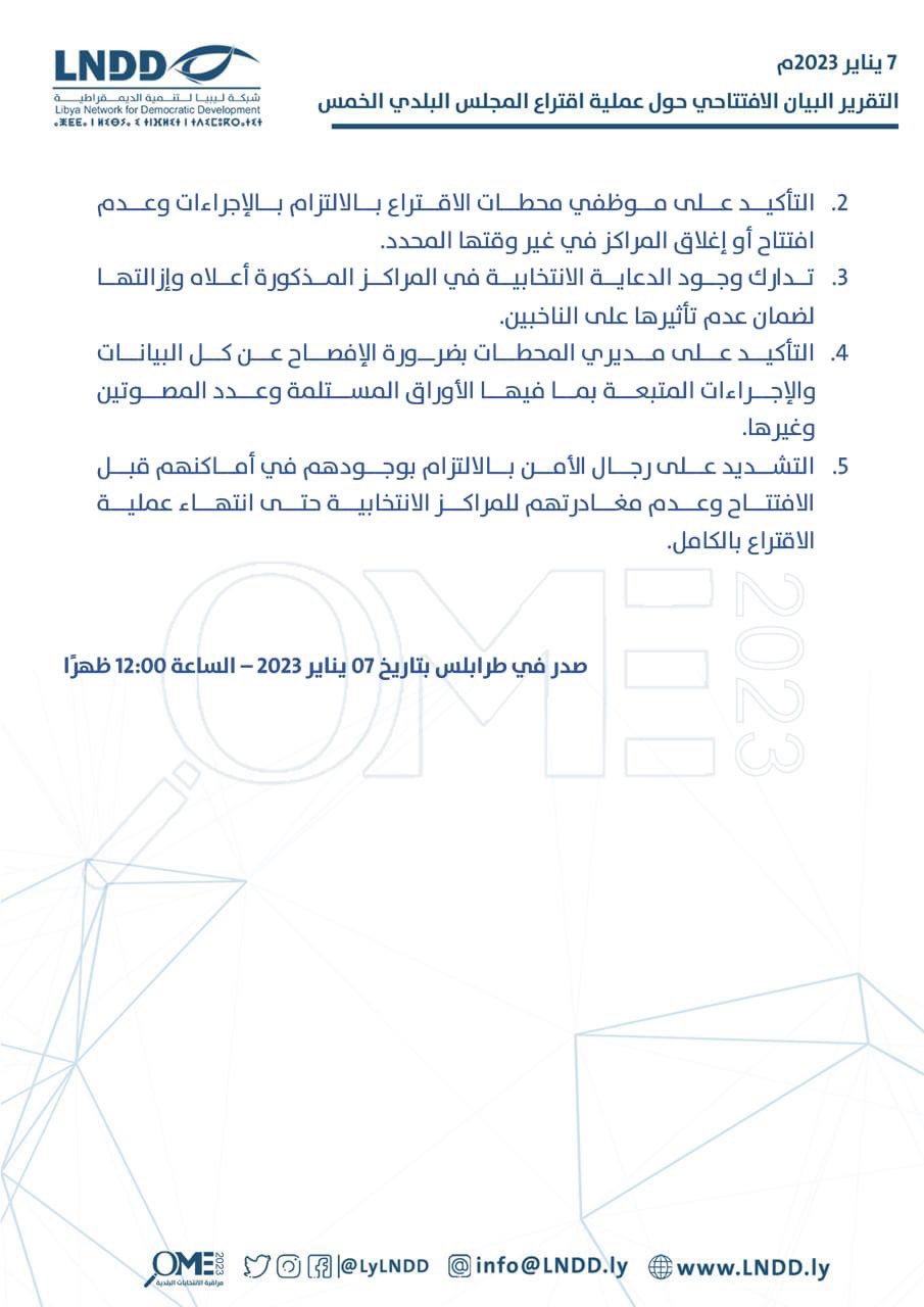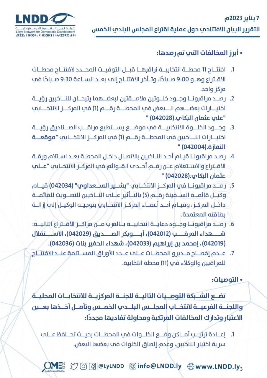 6. رصـد وجـود دعايـة انتخابيـة بـالقرب مـن مراكـز الاقتراع التاليـة: شهداء المرقـب (042012) ، أبـوبكر الصـديق (042029)، الاستقلال (042019) ، إمحمد بن إبراهيم (042033)، شهداء الحفير بنات (042036).