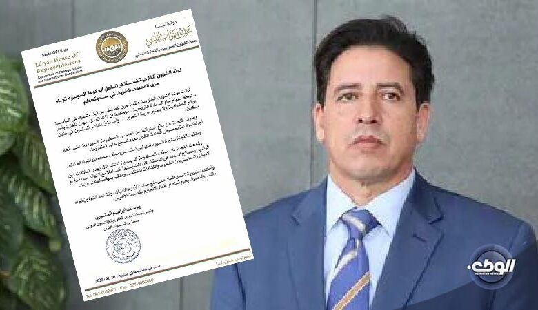 أدانت لجنة الشؤون الخارجية والتعاون الدولي بمجلس النواب الليبي برئاسة يوسف العقوري واقعة حرق المصحف من قبل متطرف في العاصمة ستوكهولم أمام السفارة التركية، مؤكدةً أن ذلك العمل مهين للغاية وأحد جرائم الكراهية ولا يعتبر حرية للتعبير، وهو استفزاز لمشاعر المسلمين في كل مكان.