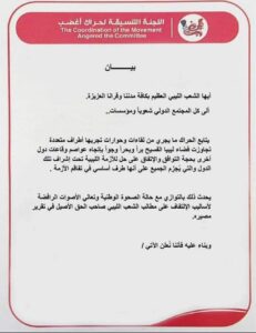 وشدد الحراك في بيانه على أن القناة الشرعية الوحيدة للتواصل في ليبيا هي البعثة الأممية للدعم ومقرها الرئيسي قائم داخل ليبيا، معتبرين أن تسابق الدول المتدخلة في الشأن الليبي هو صراع مصالح، يجعل من ليبيا ساحة حرب بأساليب مباشرة وغير مباشرة.