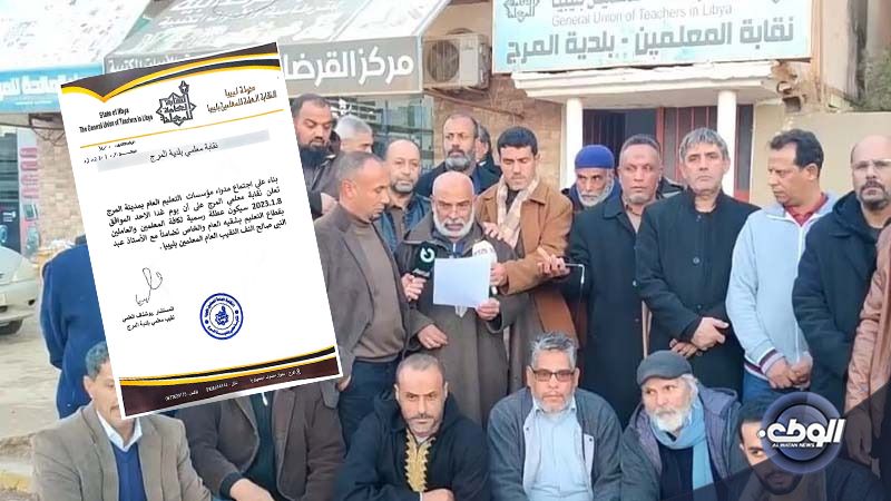 أعلنت نقابة معلمي بلدية المرج، يوم غد الأحد، عطلة رسمية لجميع المعلمين والعاملين بقطاع التعليم بشقيه العام والخاص، في خطوة تصعيدية، تضامناً مع النقيب العام للمعلمين في ليبيا عبد النبي صالح النف.