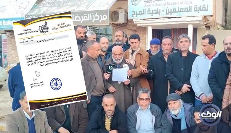 أعلنت نقابة معلمي بلدية المرج، يوم غد الأحد، عطلة رسمية لجميع المعلمين والعاملين بقطاع التعليم بشقيه العام والخاص، في خطوة تصعيدية، تضامناً مع النقيب العام للمعلمين في ليبيا عبد النبي صالح النف.