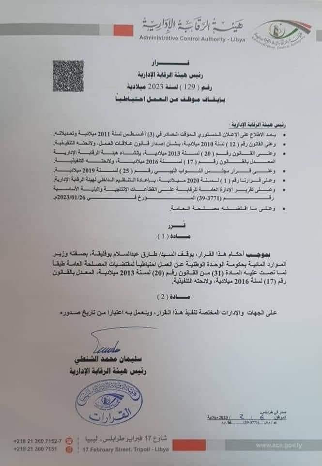 قررت هيئة الرقابة الإدارية، إيقاف وزير الموارد المائية بالحكومة منتهية الولاية، طارق عبد السلام بوفليقة، عن العمل احتياطيا لمقتضايات المصلحة العامة بحسب القرار رقم 129 لسنة 2023.