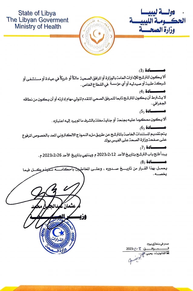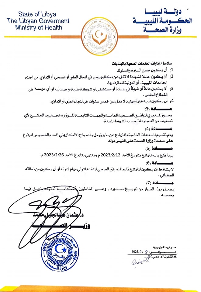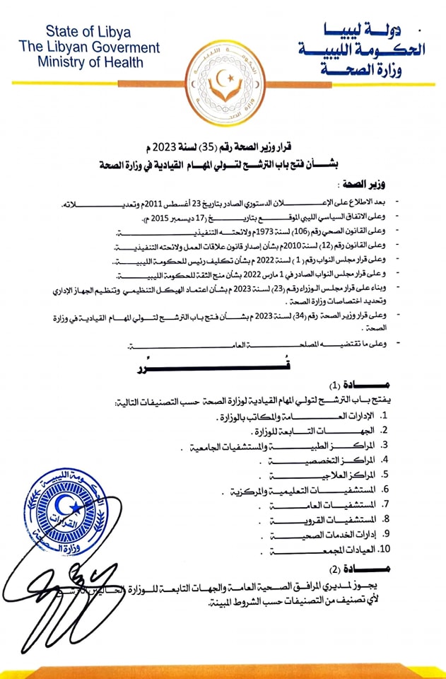 أعلنت وزارة الصحة بالحكومة الليبية عن فتح باب الترشح لتولي المهام القيادية بالوزارة والمستشفيات والمرافق الطبية المختلفة.