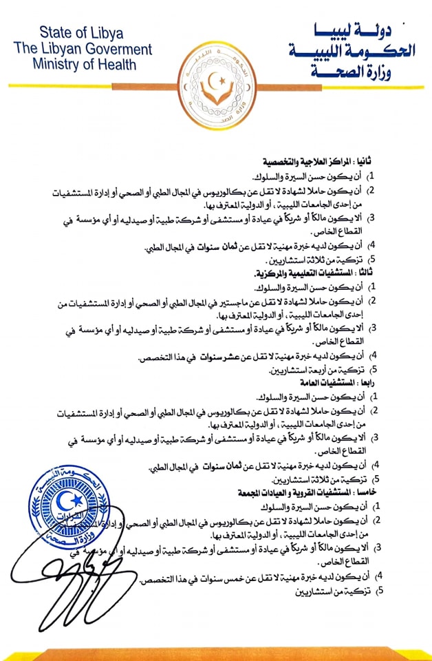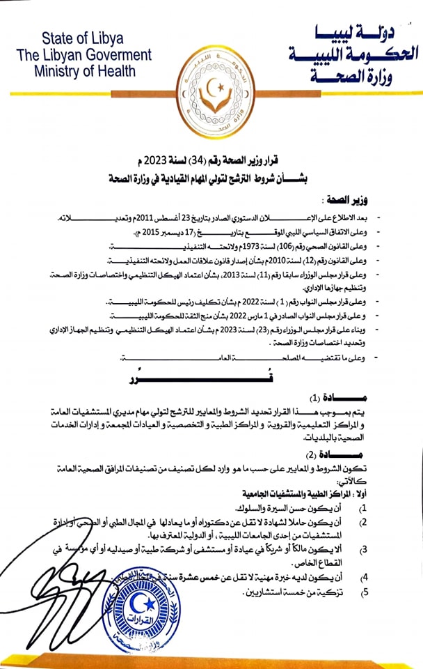 وبموجب قرار (34) لسنة 2023م تم تحديد الشروط والمعايير للترشح لتولي مهام مديري المستشفيات العامة والمراكز التعليمية والقروية والمراكز الطبية والتخصصية والعيادات المجمعة وإدارات الخدمات الصحية بالبلديات، وتكون الشروط والمعايير على حسب ماهو وارد لكل تصنيف من تصنيفات المرافق الصحية الموضحة بالقرار.