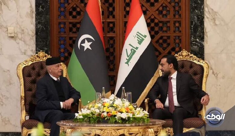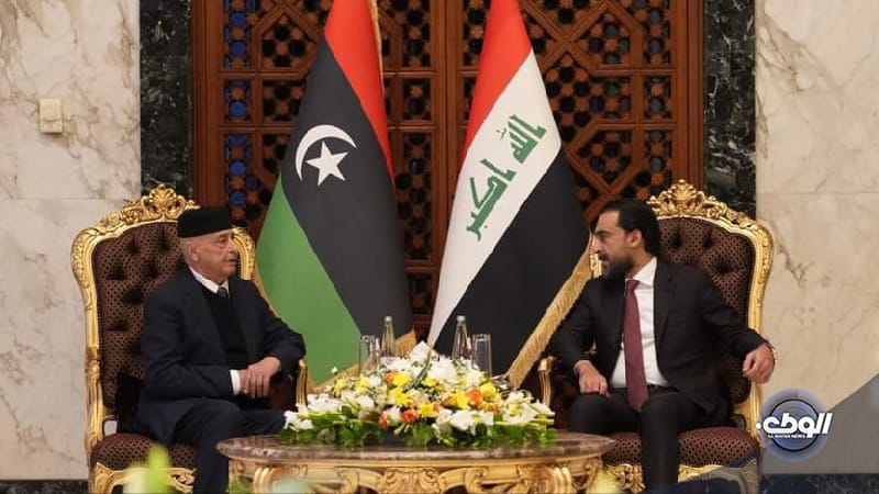 وكان في استقبال عقيلة والوفد المرافق له، رئيس اتحاد البرلمان العربي رئيس البرلمان العراقي محمد الحلبوسي.