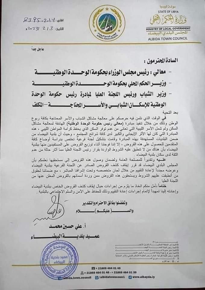 وطالب باتخاذ ما يلزم من إجراءات حيال إيقاف كشف القروض الخاصة في بلدية البيضاء وإعادته، تمهيدا لاتمام الاجراءات وإعادة التقييم وذلك حفاظا على الأمن والسلم الاجتماعي للبلدية.