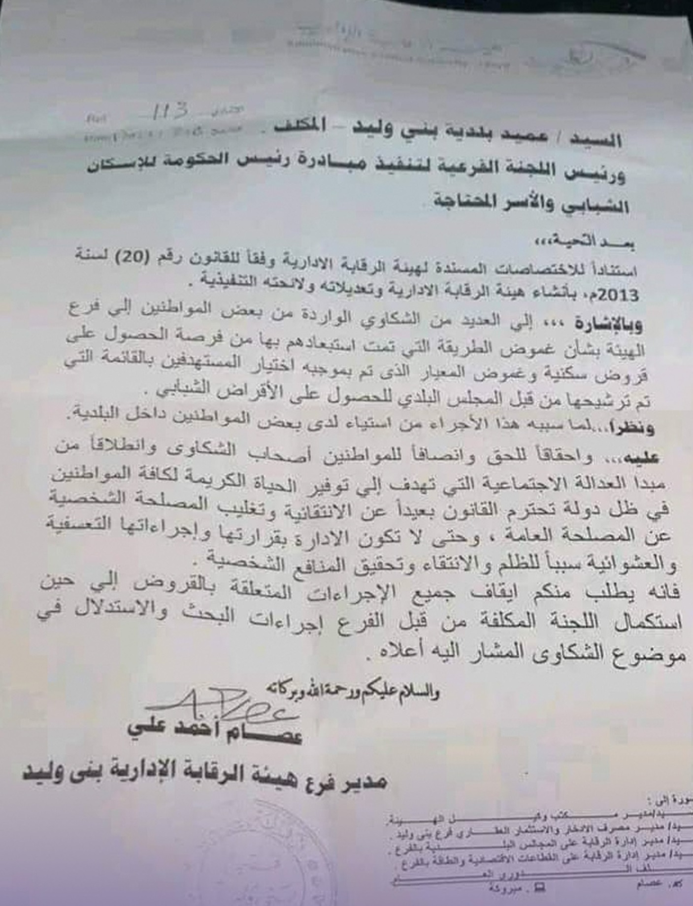 قرر مدير فرع هيئة الرقابة الإدارية بني وليد وقف “مبادرة الدبيبة” الخاصة بالقروض السكنية بسبب الغموض الذي يتم بموجبه منح القروض واستبعاد بعض المواطنين من القوائم المرشحة وما وصفه بـ “تغليب المصلحة الشخصية على المصلحة العامة”.