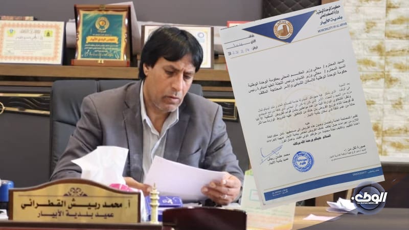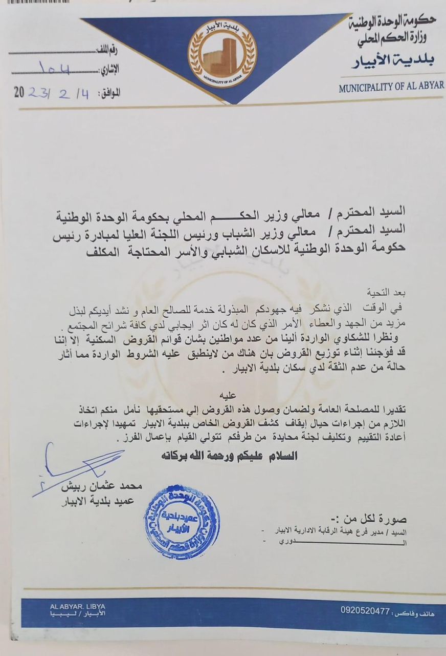 وجه عميد بلدية الأبيار محمد عثمان ربيش كتابا إلى وزير الحكم المحلي ووزير الشباب في حكومة الدبيبة منتهية الولاية، بخصوص الشكاوى الواردة الى بلدية الأبيار بشأن قوائم القروض السكنية.