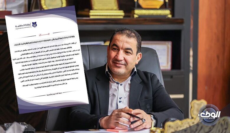 استغربت وزارة الداخلية بالحكومة الليبية، ما نشرته بعثة الأمم المتحدة للدعم في ليبيا عبر صفحتها في موقع فيسبوك، عقب لقاء وزير داخلية الحكومة منتهية الولاية مع الممثل الخاص للأمين العام للأمم المتحدة، عن جاهزية وزارة الداخلية لضمان أمن وسلامة الانتخابات، وتناولته بعض الصفحات والقنوات المحلية والدولية.