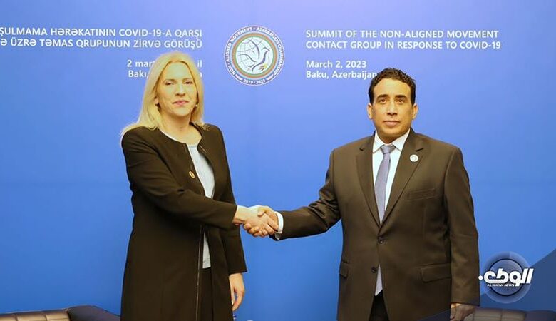 التقى رئيس المجلس الرئاسي، محمد المنفي، في باكو “جيلكا تسيفانوفيتش”، رئيسة مجلس رئاسة البوسنة والهرسك، وذلك على هامش أعمال قمة مجموعة الاتصال لحركة عدم الانحياز والمنعقدة في أذربيجان.